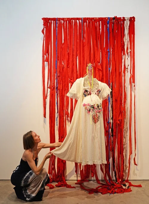This series began in the aftermath of my husband’s death and continues to investigate how the body processes grief through ritual, imagination, and transformation. Materials are selected with their histories in mind: vintage clothing and repurposed fabrics, my wedding veil (used in Morning Glory), and dried flowers, to name a few. The work is guided by personal experience and offers audiences a reflection on the cyclical nature of death and renewal.